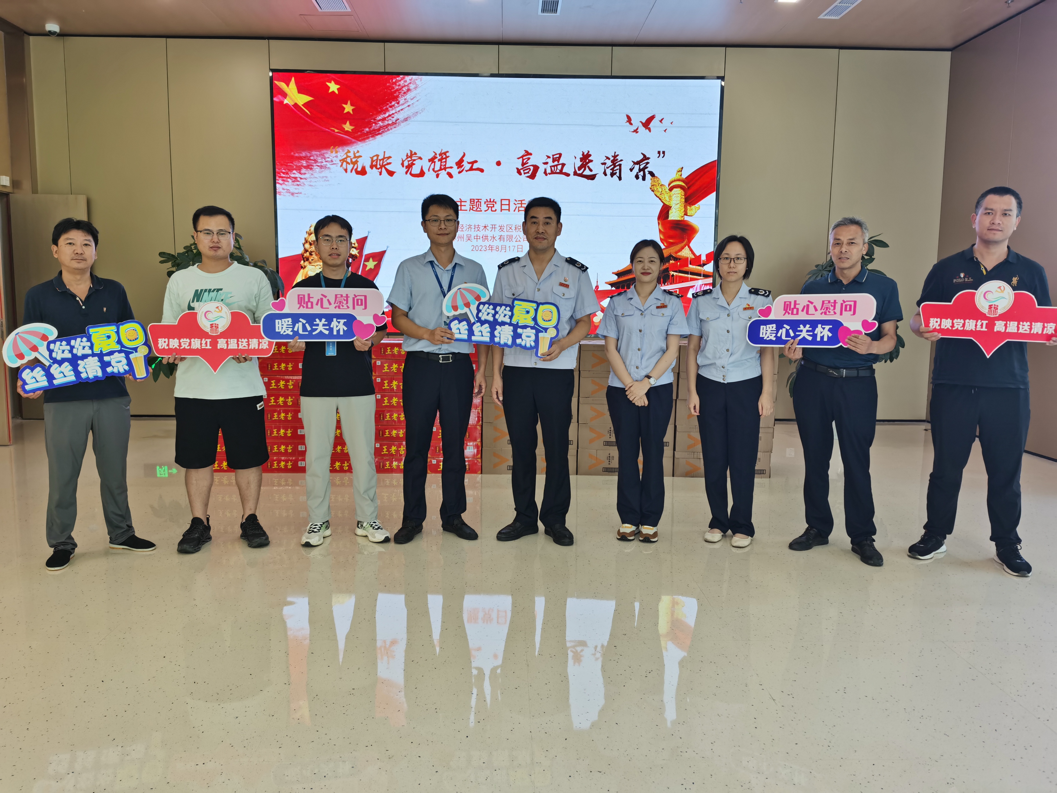 8月17日,吳中經濟技術開發區稅務局黨委和蘇州吳中供水有限公司黨委聯合開展“稅映黨旗紅 高溫送清涼”主題黨日共建活動。經開區稅務局黨員代表給我司一線員工送上精心準備的解暑飲品,為在高溫天氣保障安全供水的職業精神表示肯定和感謝。